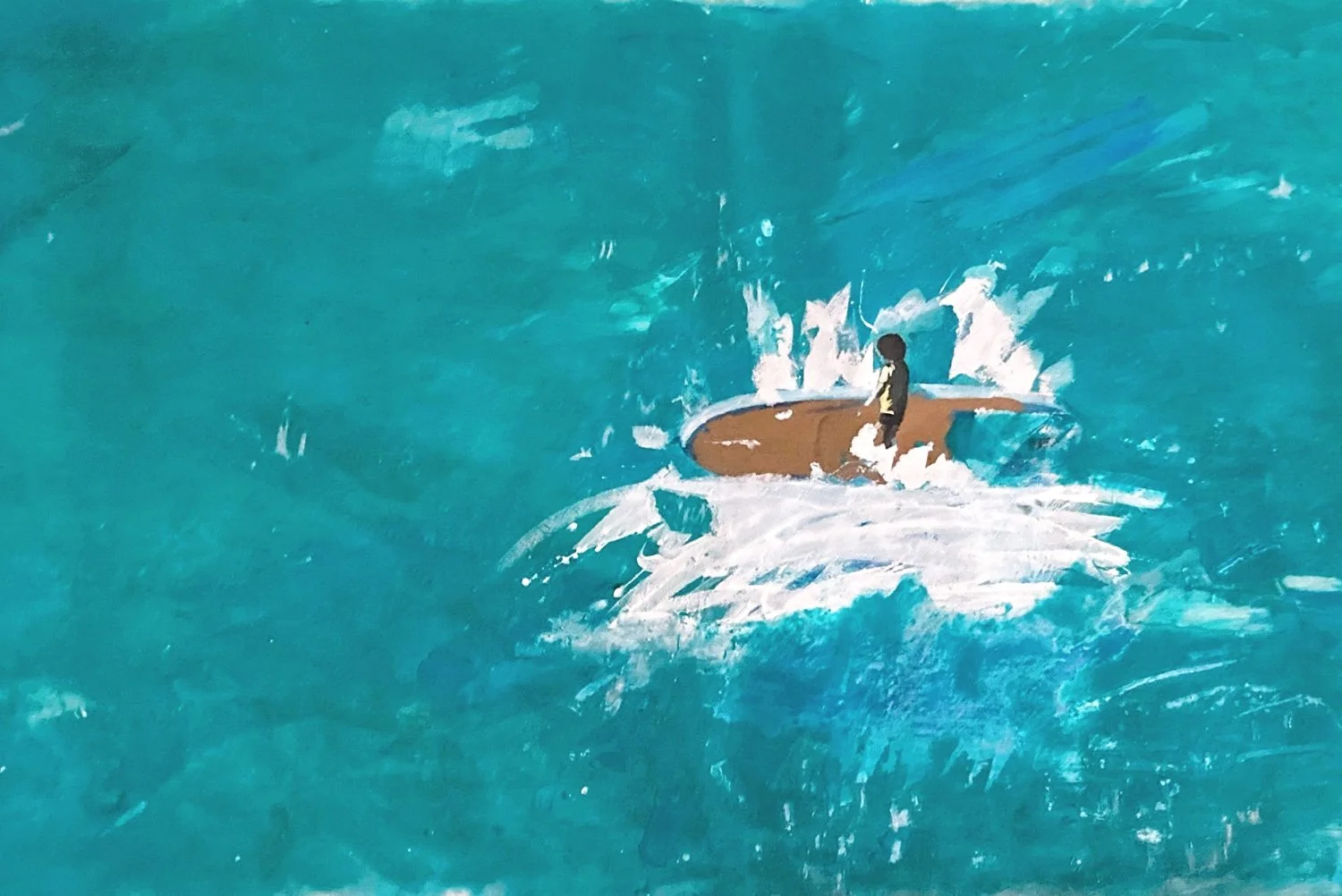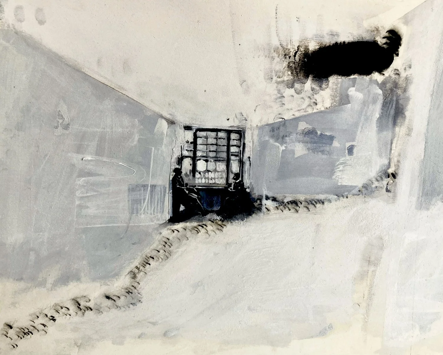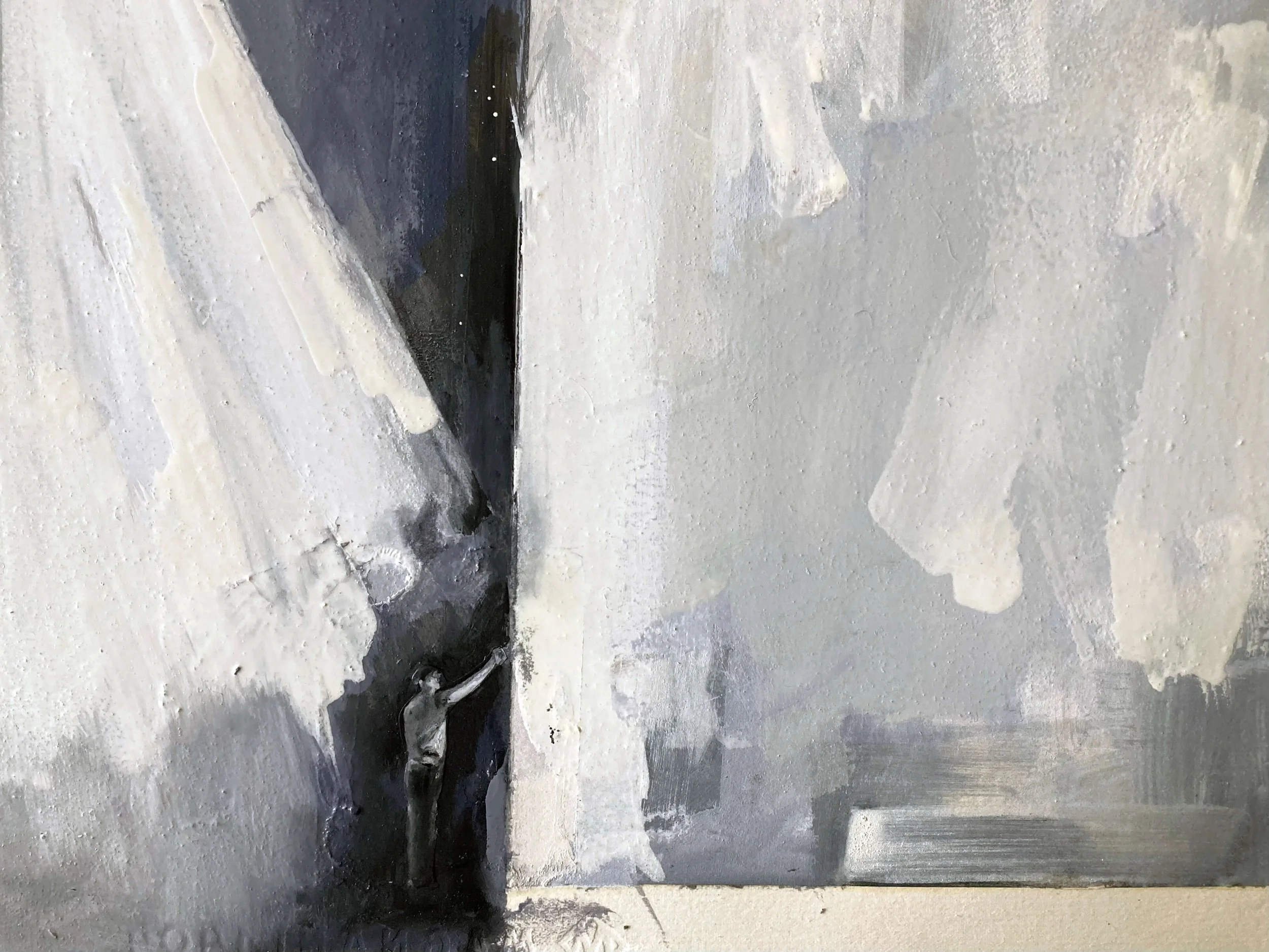 The figure stands on unstable grounds, sometimes absorbed, sometimes barely visible.